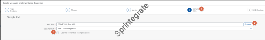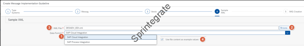 Select the EDI XML file you have ( if you have one) from either SAP Process Integration ( Orchestration) or Cloud Integration. Ensure you select Use File Content as Example Values if you have the required data. If you do not have the data, you can skip to next step.