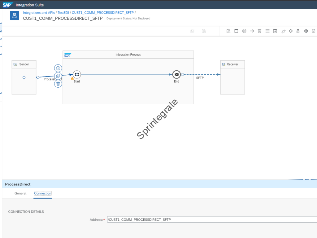 As seen in from Nov 2023, we have the support for a Receiver Process Direct Flow. So we will use that to send the data over SFTP. Create a ProcessDirect to SFTP Flow as per below screenshot. Note the ProcessDirect Address should match what you use in the Communication Details of your Trading Partner.