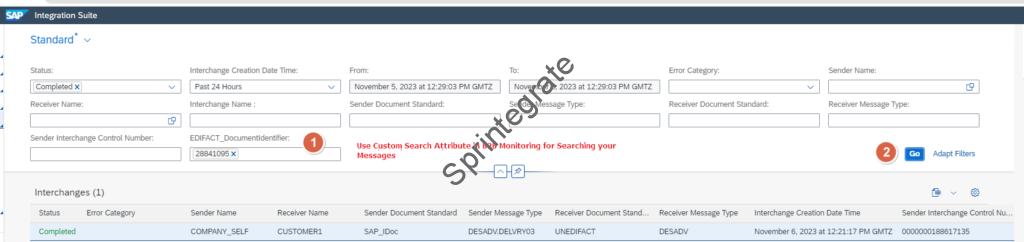 Once you have defined Custom Search Attributes in the Configuration Manager, these Attributes are also made available in your B2B Monitoring. You need to navigate to Monitoring – B2B Scenarios – Adapt Filters and select your Custom Search Attribute.