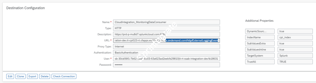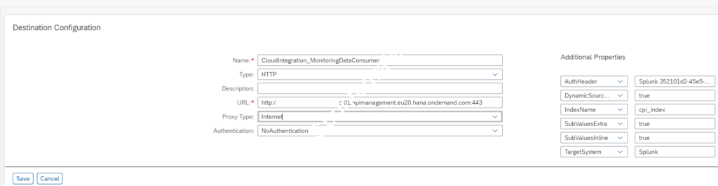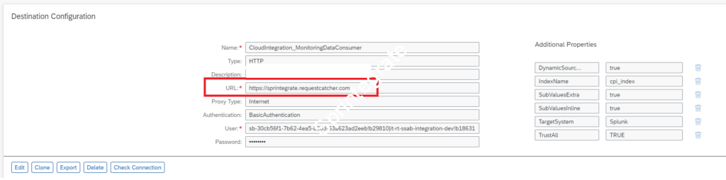 I have already shown the JSON that is received by Splunk from CPI in my post SAP CPI – External Logging to Splunk and Current Limitations. Ofcourse this just the JSON event to Splunk but the headers etc of the JSON Message are not visible. So, my initial idea was to change the Destination CloudIntegration_MonitoringDataConsumer created in the SAP BTP Cockpit of your Integration Subaccount to point to a HTTP Event listener or HTTP iflow running on CPI. The idea was I could just change the HTTP end point , point it to CPI and then capture the raw HTTP event.
