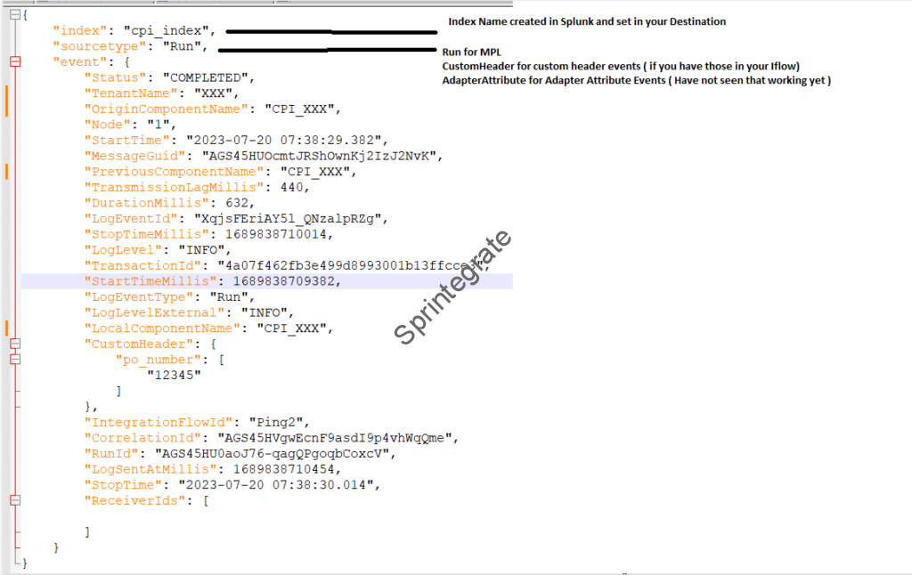 "event": "{\"Status\":\"COMPLETED\",\"TenantName\":\"XXX\",\"OriginComponentName\":\"CPI_XXX\",\"Node\":\"1\",\"StartTime\":\"2023-07-20 07:32:06.221\",\"MessageGuid\":\"AGS44vbFQi1MshUSV0bm6MitbvOb\",\"PeviousComponentName\":\"CPI_XXX\",\"TransmissionLagMillis\":122,\"DurationMillis\":800,\"LogEventId\":\"6Ti12mVAkSgutAKElR2vnw\",\"StopTimeMillis\":1689838327021,\"LogLevel\":\"INFO\",\"TransactionId\":\"17e7af6214d745ab9cd66970c6c75e77\",\"StartTimeMillis\":1689838326221,\"LogEventType\":\"Run\",\"LogLevelExternal\":\"INFO\",\"LocalComponentName\":\"CPI_XXX\",\"CustomHeader\":{\"po_number\":[\"12345\"]},\"IntegrationFlowId\":\"Ping2\",\"CorrelationId\":\"AGS44vai3SKMZOnux3FwwQLgvClS\",\"RunId\":\"AGS44vYeRXS60TME8emQXS2Cgqf_\",\"LogSentAtMillis\":1689838327143,\"StopTime\":\"2023-07-20 07:32:07.021\",\"ReceiverIds\":[]}"